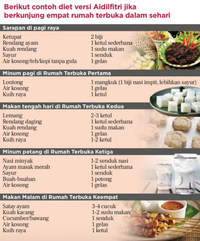 Perkara utama mesti diingat ketika ke rumah terbuka ialah elakkan kekenyangan terlampau supaya kalori diet seharian tidak lari daripada jumlah biasa,” katanya.