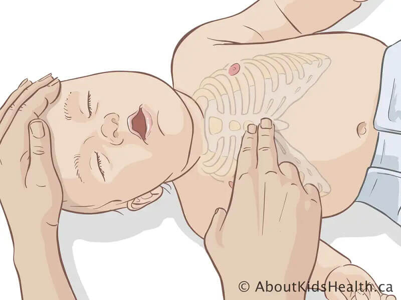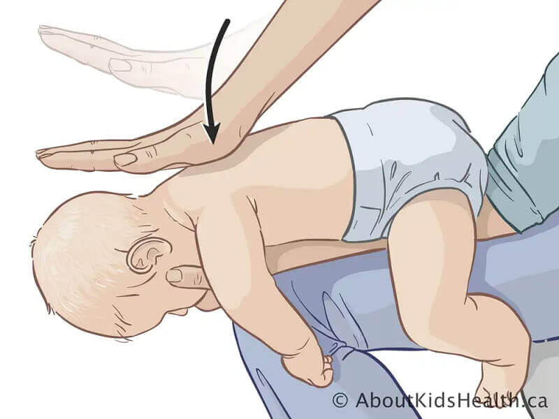 “Sekiranya kanak-kanak yang tercekik itu berumur setahun ke bawah, dan masih ada nadi, alihkan mukanya ke arah bawah, dan ampu badannya dengan lengan anda. Sokong kepala anak dengan memegang bawah rahangnya. Pastikan kepala anak lebih rendah daripada dada mereka dan tepuk bahagian belakang di antara bilah bahu. Jika anak anda masih tidak dapat bernafas, alihkan mukanya ke atas sambil memegang anak dan pastikan kepala mereka lebih rendah daripada dada. Letakkan dua jari di tengah dada mereka dan berikan lima tolakan. Ulang prosedur pukulan belakang dan tolakan dada sehingga objek kelihatan dan boleh dikeluarkan.”