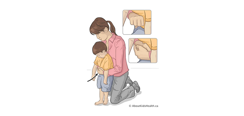 “Jika anak anda berusia lebih daripada satu tahun, lakukan Heimlich maneuver. Berdiri di belakang anak dengan lengan anda di sekeliling pinggangnya. Anda harus membuat penumbuk dengan satu tangan, dan letakkan sisi ibu jari penumbuk tersebut ke atas perut anak, di bahagian bawah tulang rusuk dan atas pusat. Pegang penumbuk dengan tangan yang lain. Tolak penumbuk dengan cepat ke arah dalam dan atas perut. Lakukan pergerakan ini sebanyak lima kali dan bergantian dengan tamparan belakang sebanyak lima kali untuk cuba mengeluarkan objek tersebut.”