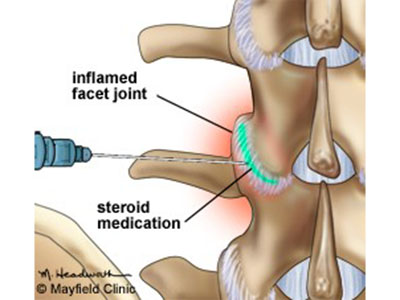 The involved facet joint is injected with steroids to reduce inflammation and