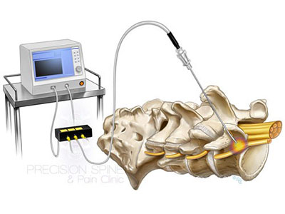 This procedure utilizes the radiofrequency energy to disrupt the facet’s medial branch nerve so that it can no longer transmit pain from the injured facet joints. The outcome, no more axial back pain cause by facet joints arthropathy.