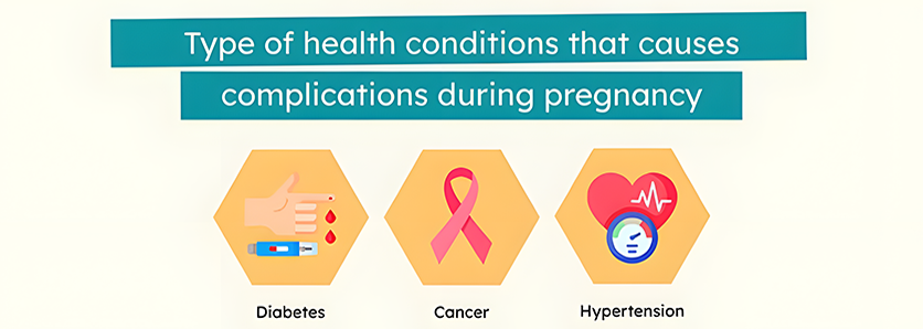 Some examples of health conditions or diseases that may cause complications during pregnancy are diabetes or cancer. Â