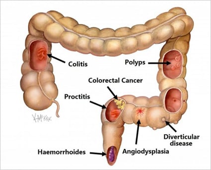 - Colitis – keradangan usus yang disebabkan kuman atau masalah kronik (ulcerative colitis)