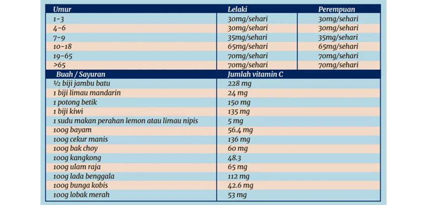 Lihat jadual di bawah untuk pengambilan Vitamin C yang sesuai mengikut jantina dan kadar umur (dari Recommended Nutrients Intake For Malaysia 2017).
