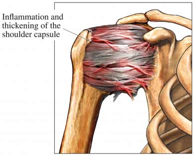 - Unknown cause – this condition is also called ‘adhesive capsulitis’; in the majority of cases the cause is not identified but there is an association with certain medical conditions such as diabetes mellitus, ischemic heart disease, thyroid gland problems (hyper or hypo-) and Parkinson’s disease (a neurological condition that is progressive and characterized by involuntary movements and generalized rigidity of joints).
