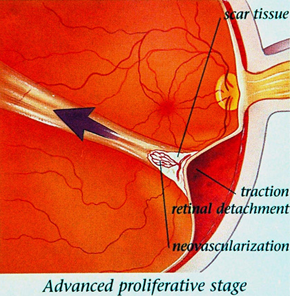 In its most advanced stage, new abnormal blood vessels proliferate (increase in number) on the surface of the retina, which can lead to scarring and cell loss in the retina.