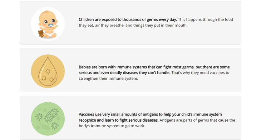 Immunity is the body’s way of preventing disease. Your baby’s immune system is not fully developed at birth which can put your baby at a greater risk for infection. Vaccines reduce your child’s risk of infection by working with the body’s natural defenses to help safely develop protection against disease.