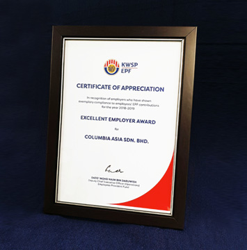 Columbia Asia has been awarded Excellent Employer Award 2019 by the Employee Provident Fund (EPF). The Certificate of Appreciation was awarded by the EPF Deputy Chief Executive Officer (Operations), Dato’ Mohd Naim Daruwish at the EPF Best Employer Award Ceremony held at Concorde Shah Alam on December 4, 2019. This award is in recognition of employers who have shown exemplary compliance towards their employees’ EPF contributions for the year 2018/2019.